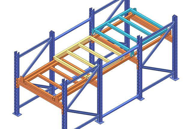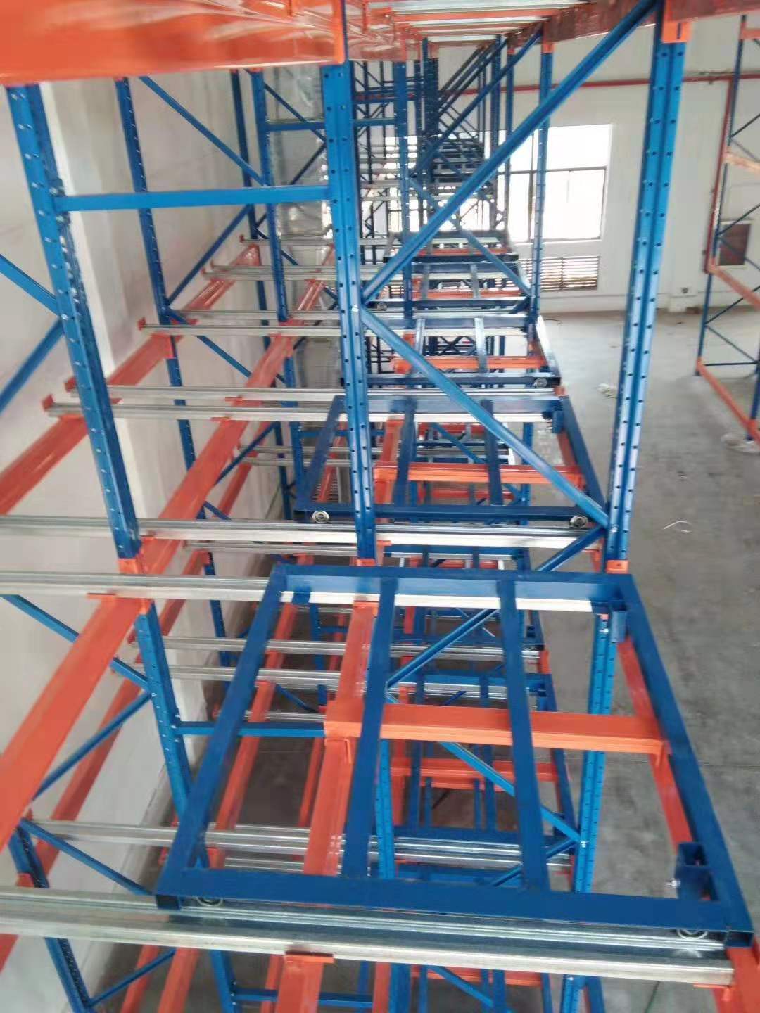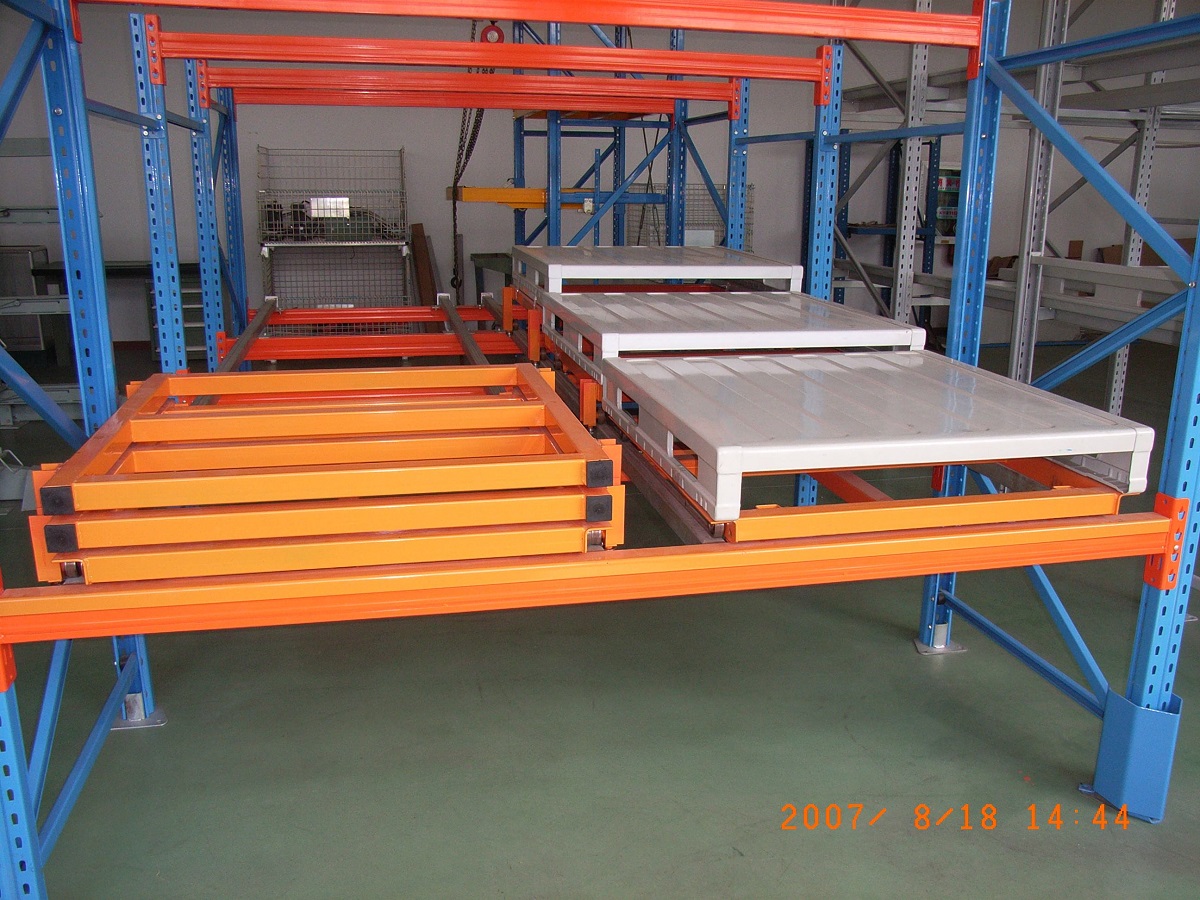 后推式貨架又名壓入式貨架——是在前后梁間以多層臺(tái)車重疊相接,從外側(cè)將疊棧貨物置于臺(tái)車推入,后儲(chǔ)存之貨品會(huì)將原先貨品推往里面。